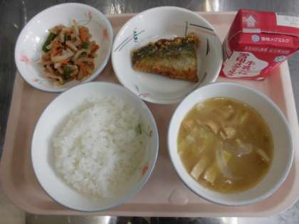 ごはん 牛乳 さばのたつたあげ 野菜のきんぴら 春野菜のみそ汁