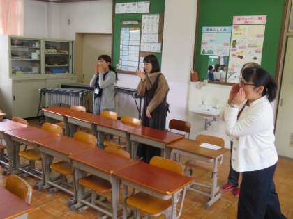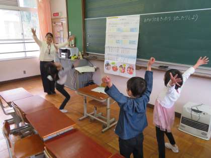 2年生は「音楽」をしていました。楽しそうな歌を歌いながら,ノリノリのダンスも披露していました。保護者も一緒に参加していました。