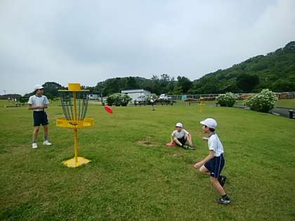 釣りの次はフライングディスクゴルフです。初めはなかなかうまくいかなかったけれど,どんどんコツをつかんで上手に進んで行きます。