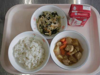 麦ごはん 牛乳 鶏肉と野菜の煮つけ もやしの煮びたし