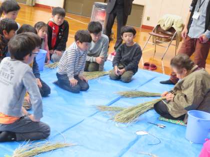 今日の5・6校時,先週に続き,地域の方を講師にお招きして注連(しめ)縄作りの仕上を行いました。