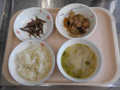 麦ごはん 煮しめ ごまめ 京風みそ汁