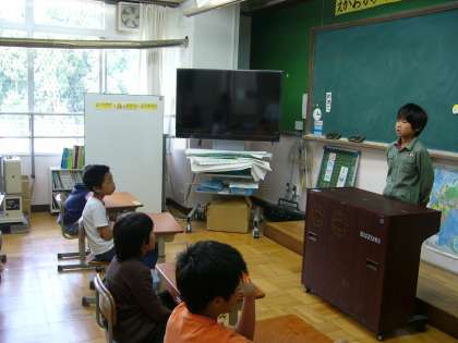 日替わりで児童がスピーチをします。内容についての感想や質問など交流をします。話すこと聞くことを自然に興味を持って行います。