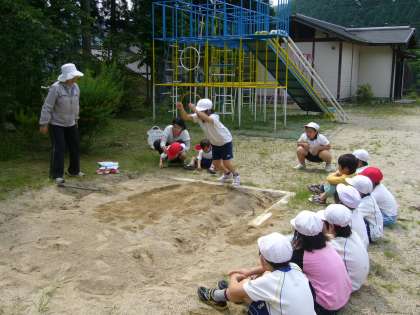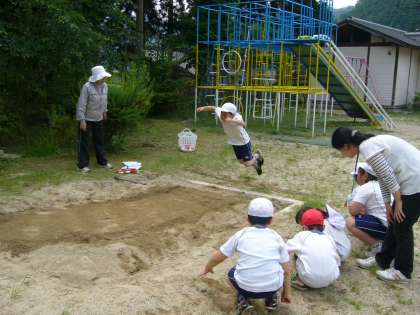 新体力テストの測定場面です。立ち幅跳びの測定です。踏み切り板のところに立ちどれだけ跳べるかの測定です。上体の動かし方の技能もありますが、体育の時間にどれだけ跳べるかなという一定の幅にチャレンジする運動がありますが、それが遊びの時間にも発展していれば数値は伸びるはずですが〜。