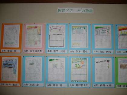 畑や田んぼでの活動を新聞にして表現しています。1〜6年までそれぞれ記事は多少違いますが、同じサイズの新聞にまとめるので他学年のものも参考になります。見出し、出来事、自分の感想、絵など配置も考えながら工夫しています。