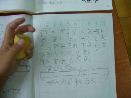テープ図を使っての説明をノートに一人一人が記述しています。はじめは〜人で、何人か来たので、〜人になったというタイプのものでした。文章に合わせてテープ図に表していました。