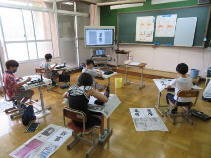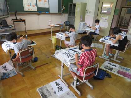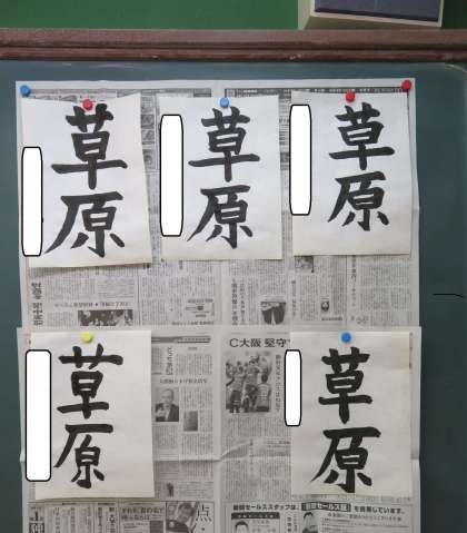 初めに,「筆の正しい持ち方」と「姿勢」について確認をし,さっそく『草原』の練習を始めました。結構難しい字と思いましたが,1時間目の練習としてはそれぞれきれいに書けました。