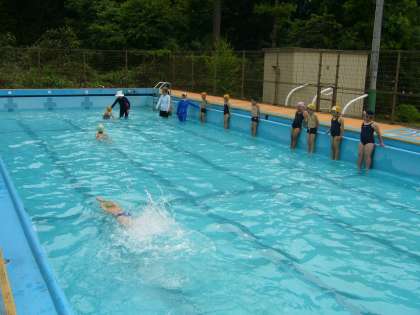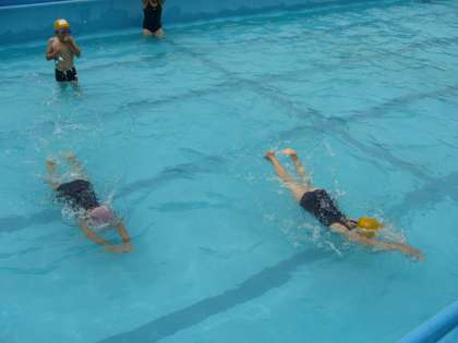 2年生はプールを横にして、3年生は縦にして練習をしていました。プール2日目です。ためておいた水なので水温がある程度あり、寒くなく水泳ができました。