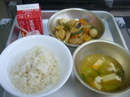 麦ごはん、牛乳、プリプリ中華いため、豆腐と青菜のスープ