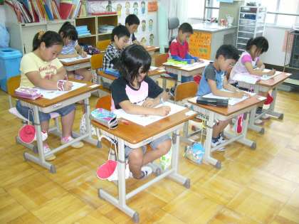 足が床に着き、鉛筆を持たないほうの手で紙を押さえて、背中も伸ばして書いていました。