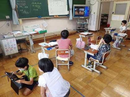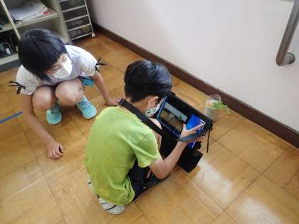 初めの様子を記録するため,茎の長さを測ったり,葉の数を数えたり,全体の様子を写真に収めたりしていました。写真を撮るときには,タブレットの画面がテレビ画面に共有されているので,テレビを見ながらアングルが一定になるように声をかけあっていました。