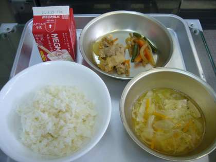 胚芽米ごはん 牛乳 豚肉のしょうがいため 野菜のきんぴら キャベツの吉野汁
