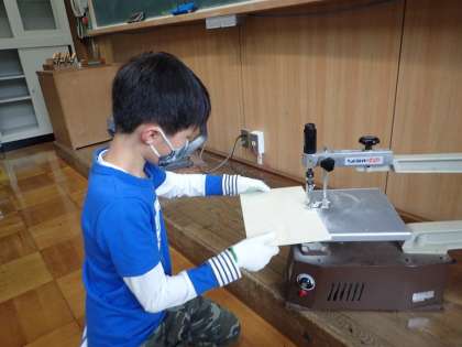 図工では,電動の糸のこを使ってビー玉迷路を作っています。
