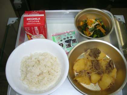 麦ご飯、牛乳、肉じゃが、小松菜の煮びたし、黒大豆 です。肉じゃがは味付けもよくおいしくいただきました。
