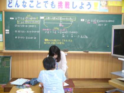 小数になっても同じように式を立てて計算すればいいこと、小数÷小数の仕方を学習しました。一人学級でもしっかり板書しての授業です。