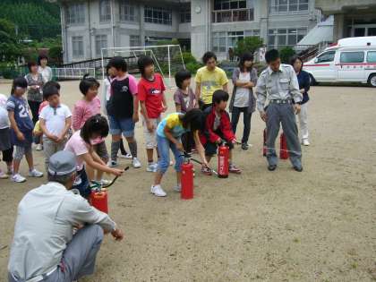 消火器を使う訓練も全校児童が体験しました。少人数ならではです。