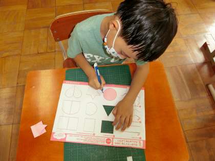 そして,カッターナイフの持ち方や使うときの姿勢などを確認してから,練習を始めました。まっすぐな線,ギザギザの線,曲線など,いろいろな線に挑戦して頑張っていました。