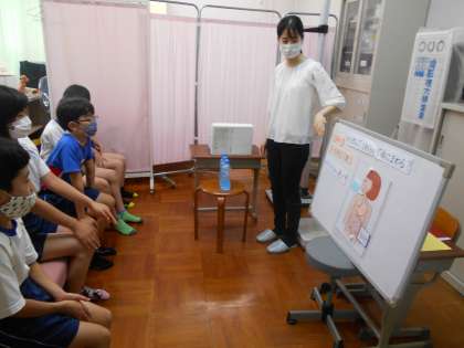 1・2年生には「排便について」,3・5年生には「熱中症について」