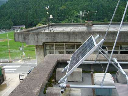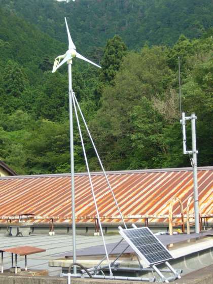 風力・太陽光発電が、屋上に設置してあります。このエネルギーを利用して、防犯用センサー、来校者や登下校する児童への呼びかけ放送などに利用しています。