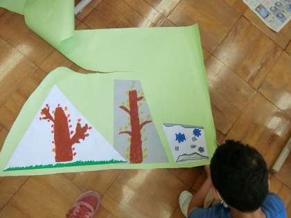 前回の図画工作「いろいろなかたちのかみから」の学習で紙の形から思いついたものを絵に表していきました。今日は,その時間につくった絵をお話を作りながら組み合わせて一つの絵にしていきました。