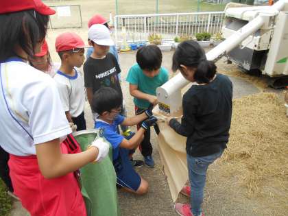 地域の方々に協力していただき,刈り取った稲を脱穀しました。