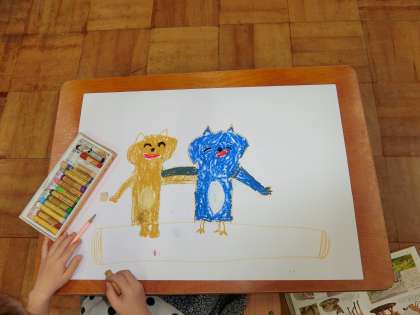 2年生の2人は,図画工作の「見て 見て おはなし」の題材で,「さよなら ともだち」の本を読んで心に残ったことを絵に表しています。