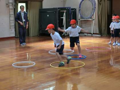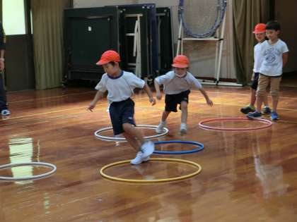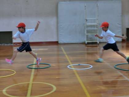 フラフープを島に見立て,島から島へと跳んでいく,というものです。走りながら跳んだり,ケンケンで跳んだり,いろいろな跳び方をしていきました。慣れてきた頃に追いかけ合いをしながら跳んでいくというのにも挑戦しました。前の子は追いかけてくる子にタッチされないよう,頑張って跳んでいきます。追いかける方はなんとかタッチしようと頑張ります。