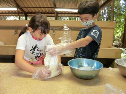 静原キャンプ場に到着後,児童会の子どもたちがリーダーとなり「みんな遊び」をしました。そしてその後は,子どもたちお待ちかねの「ツイストパン作り」に取り組みました。パンの材料を準備したり,パンを焼く火をおこしたり,みんなで協力してツイストパン作りをすることができました。