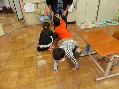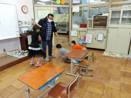 まず,子どもたちの大好きなten stepの歌を歌ったり,ルイス先生が言われた体の部分をタッチするタッチゲームなどをして楽しみました。