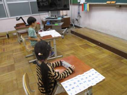 今日の5校時,1年生はこれから始まる自主学習の進め方について,担任の先生からお話がありました。2年生は,かけ算カードを並べながら九九を確かめていました。