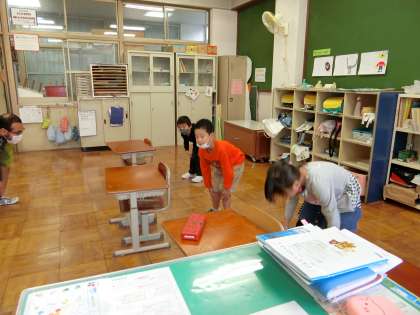 「タッチゲーム(指示された色を教室の中で探してタッチするゲーム)がたのしかったです。」