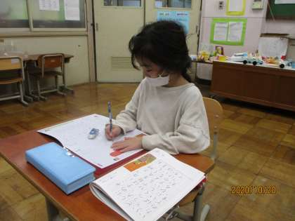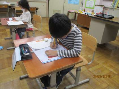 書写の学習の様子です。文字の中心に気をつけながら,教科書を見て一画一画ていねいに書いている様子です。