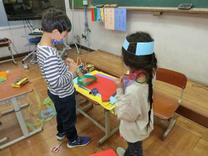 次の時間もどんどんわっかをつくり,かわいい飾りをつけて,思い思いに変身してほしいと思っています。