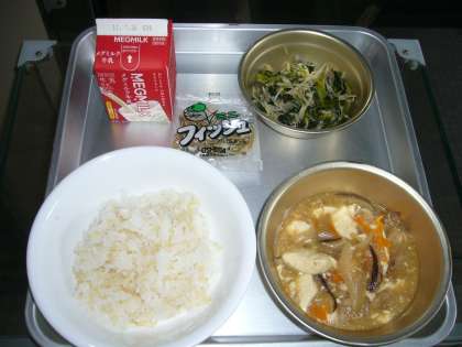 麦ごはん 牛乳 五目どうふ ほうれん草ともやしのいためナムル じゃこ