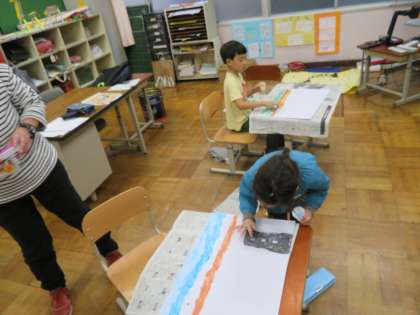 2年生は図工の時間で,とろとろ絵の具を使って指や手で絵をかいていました。自分が作りたい色を考えながら,集中して楽しそうに取り組んでいました。