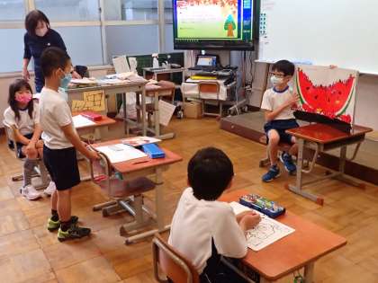 今日は,1年生の教室へ5年生の広報委員が読み聞かせに行きました。