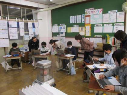今日の7校時,5年生は総合的な学習の時間にタブレットPCにログインする活動を行いました。担任の先生のからユーザーIDと初期パスワードを教えてもらい,5人の子どもたちはそれを入力してメニュー画面が出ると,驚きと喜びの歓声があがりました。その後は,パスワードを入力して基礎的なことを教わっていました。