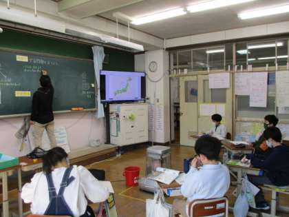 3年生は,算数でみらいへのつばさを頑張っていました。書かれているメモの内容をきちんと読み取り,そこから答えを導き出すことに集中しながら取り組んでいました。5年生は,社会でわたしたちの生活と森林の学習でした。人工林や天然林について調べていくにあたり,自分たちでこれからの学習問題を考えていました。