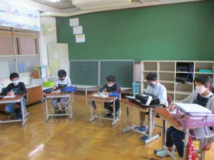 4年生は,担任の先生が子どもたちに自己紹介をしていました。どんなお話だったのかはまた聞いてみてください。6年生は,子どもたちが自己紹介カードを書いていました。他の人には絶対に見せてはいけないという約束があるので,みんながどんなことを書いているのか発表の時が楽しみなのではと思います。