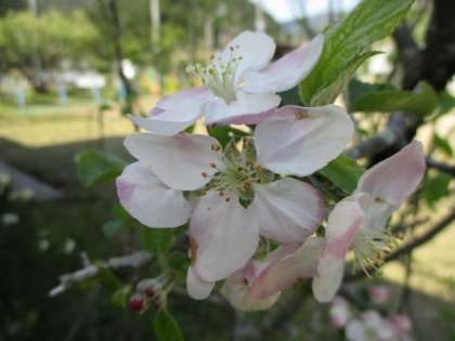 リンゴの花の開花が続いています。桜にも似たうすいピンク色っぽいの花がきれいに咲いていますが,満開に近づくにつれて白色に変わっていきます。なお,桜もリンゴだけでなく梅や桃,イチゴ,アーモンドもバラ科です。