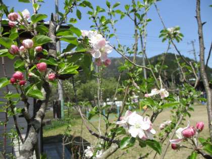 本校のリンゴの花が,昨日にもましてさらに開花してきています。写真では撮れませんでしたが,虫たちが花の蜜を吸いに来ていました。明日明後日と,さらに花を咲かせてくれそうに思います。