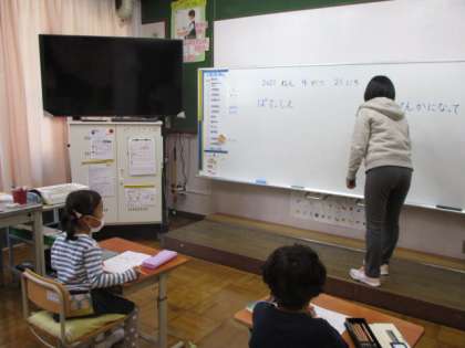 今日の5校時,1年生は学級活動で自己紹介カードを書いていました。わからない文字については,担任の先生が教えていました。2年生は,国語でふきのとうの学習でした。一つの場面に対して,工夫しながら音読することを頑張っていました。