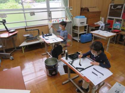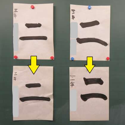 前回,自分が書いた字を見て,どこをどう直せばよいのかを考えてから練習を何度も重ね,最後は半紙に書いていきました。