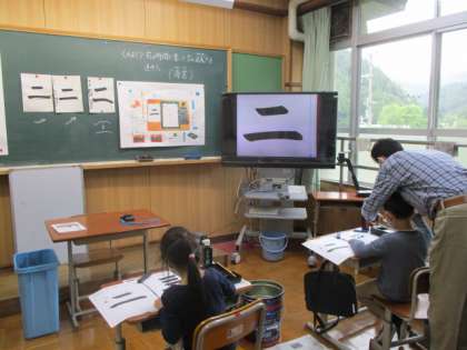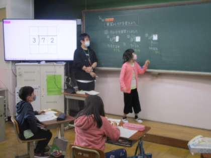 3年生は,書写で毛筆「二」の学習でした。書写担当の先生と一緒に,筆づかいを意識しながら頑張っていました。4年生は,算数でわり算のひっ算の学習でした。ひっ算をしていく順番や考え方について,みんなで話し合いながら取り組んでいました。6年生は,外国語科で先生の新たな一面を紹介する学習でした。出題者が事前にインタビューしてきたことを話し,その内容を聞いて誰のことなのかをみんなで考えていました。