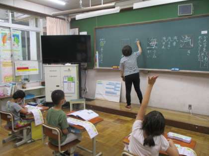 今日の5校時,1年生はおもちやとおもちゃの学習でした。小さい文字が入るとどのように読むのかを一緒に確かめていました。2年生は,書写で漢字の練習でした。一つ一つの漢字を丁寧に書くとともに,言葉としてどんな使われ方をしているのかもみんなで考えていました。