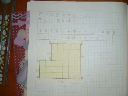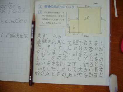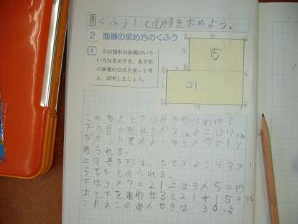 長方形を組み合わせた図形の面積の求め方をノートに書いています。なぜ、そうするのかの説明を書くこと話すことを目標としています。面積の基本となる1平方センチメートルの正方形のいくつ分かという線で分けている図も描いています。