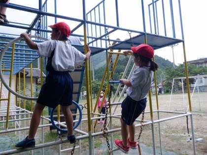 今日,体育の学習で遊具遊びをしました。2年生では自分の力で3階まで上がることができるようになります。