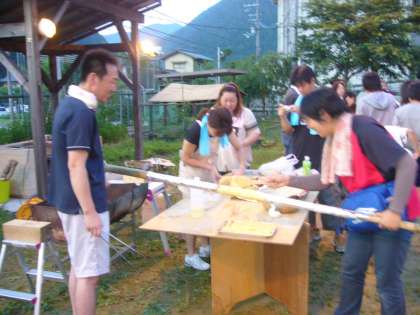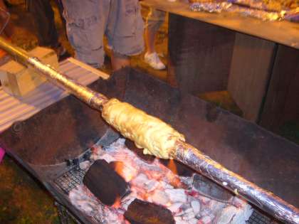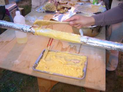竹にアルミホイルを巻いたものにケーキのもとのどろどろを貼り付けて焼きます。