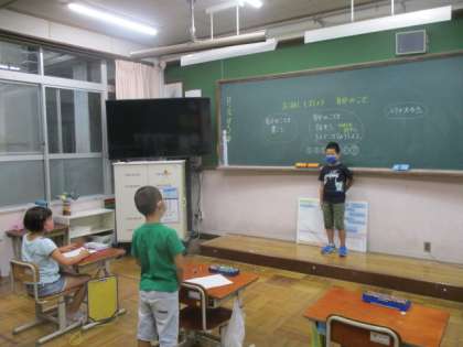 今日の3校時,1年生は算数でたし算やひき算の問題を作っていました。絵を見て作るのは難しいようでしたが,何とか頑張って考えていました。2年生は,自分のことについてみんなに話していました。内容をよく聞き,発表についての質問もしっかりとできていました。