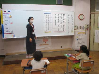 今日の5校時に,1年生国語の校内研究授業を行いました。「すきなものなあに」の学習で,静原の好きなものカードを読んで好きなものとその理由を伝えることがねらいでした。後ろで見ていた先生や指導主事の方に,カードを見せながら読んで伝えている様子が見られました。少し恥ずかしい様子も見られましたが,何とか頑張っていました。
